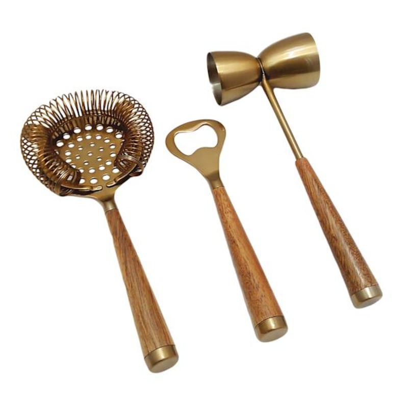 Crafted with charm and functionality.Enhance your home bar with this set of bar tools, featuring a perfect combination of brass and wooden accents. Equipped with all the essentials, it offers everything you need to craft your favorite cocktails. Made for b