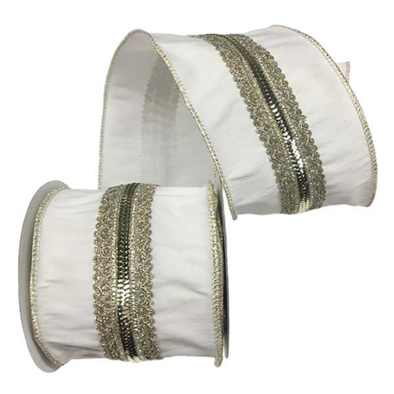 Our 4in. Ivory with Gold Trim Ribbon is 4in wide and 5 yards long. Crisp, lightweight and easy to work with and a season inspired design to make decorating even more merry and bright. Wired edges are ideal for shaping. Ribbon is always great for festive pa
