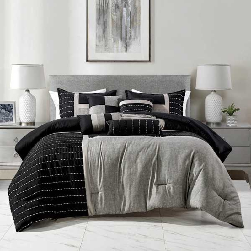 Add a pop of modern style to your bedroomThis 7-piece striped comforter set is designed to bring a touch of contemporary charm to your bedroom decor. Its sleek black and grey color palette effortlessly blends with any existing furnishings, making it a vers