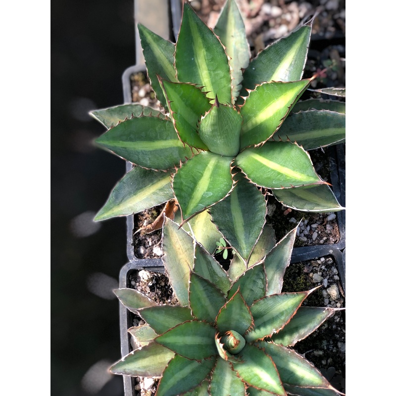 A brightly-colored, compact agave native to Mexico and south Texas that reaches no more than 12″ tall and 18″ wide. Dagger-like leaves are dark green with a light green interior stripe and possess serrated teeth along its margins. This exceptionally good-looking cultivar is great in pots and can be planted in mass for great effect. Can be planted in full or sun or light shade. Hardy to 0 degrees, USDA zone 7.