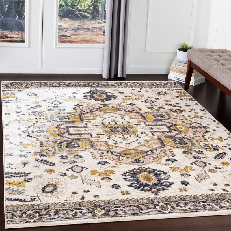 The Alexandria collection features a detailed traditional medallion pattern in an elegant blend of camel, navy, ivory, sky blue, charcoal, butter, and white. With a blend of polyester and polypropylene, this rug features a comfortable pile and minimal shedding. Great for high-traffic areas. Machine woven in Turkey. Spot or professionally clean only. Rug pad recommended.
