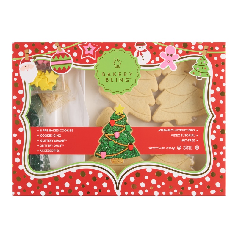 Bakery Bling's holiday gift kit includes eight Christmas tree-shaped vanilla cookies to dress up with icing, candy ornaments and their famous glittery sugar. A perfect gift for busy families, this festive decorating kit lets you skip the baking to spend yo