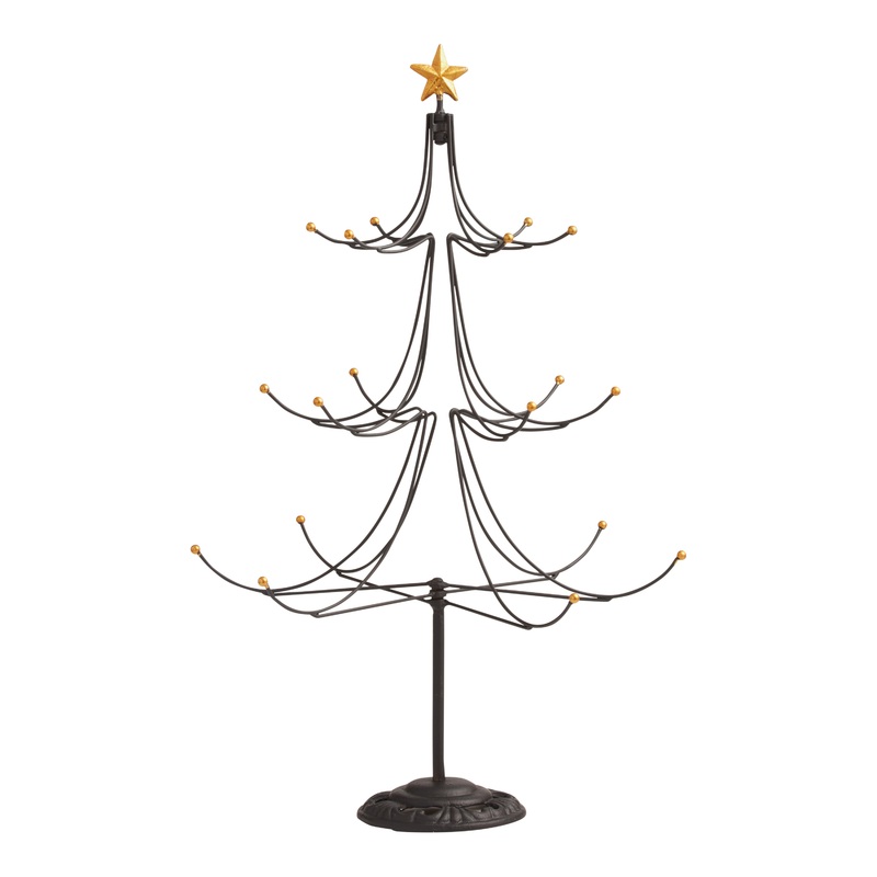 With a modern conical design, our exclusive Christmas tree displays your most beloved holiday ornaments. Crafted of metal with a black finish, this tabletop tree holds up to 21 ornaments from little hooks. With a sturdy pedestal and a gleaming gold star, t