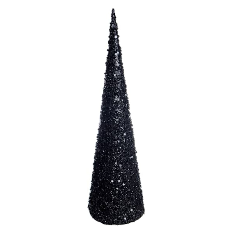 Add bold sparkle to your holiday decor with this 30in. Black Glittered Cone Tree. Its sleek cone silhouette and deep black glitter finish catch the light for a modern, timeless look on mantels, shelves, and entryways. Crafted from lightweight plastic with a stable base, it’s easy to display on a console or layer into a festive vignette. Style it solo for minimalist impact or mix with other tabletop trees to build height and texture. Pairs beautifully with metallic accents and monochrome palettes for a striking Christmas display.