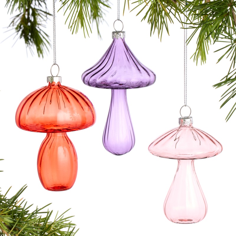 Brighten your holiday in woodland-glam style with our chic mushroom ornaments in purple, pink and red. Handcrafted of blown glass in three organic shapes, they’re ready to embellish your branches and shine in the glow of your Christmas lights.