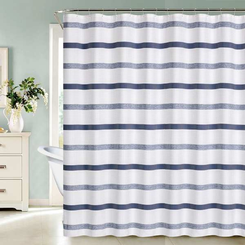 Transform your bathroom into a soothing oasis with our Wesley Waffle Stripe Shower Curtain in beautiful shades of blue. Made from polyester, this curtain adds a stylish touch to any bathroom decor.
