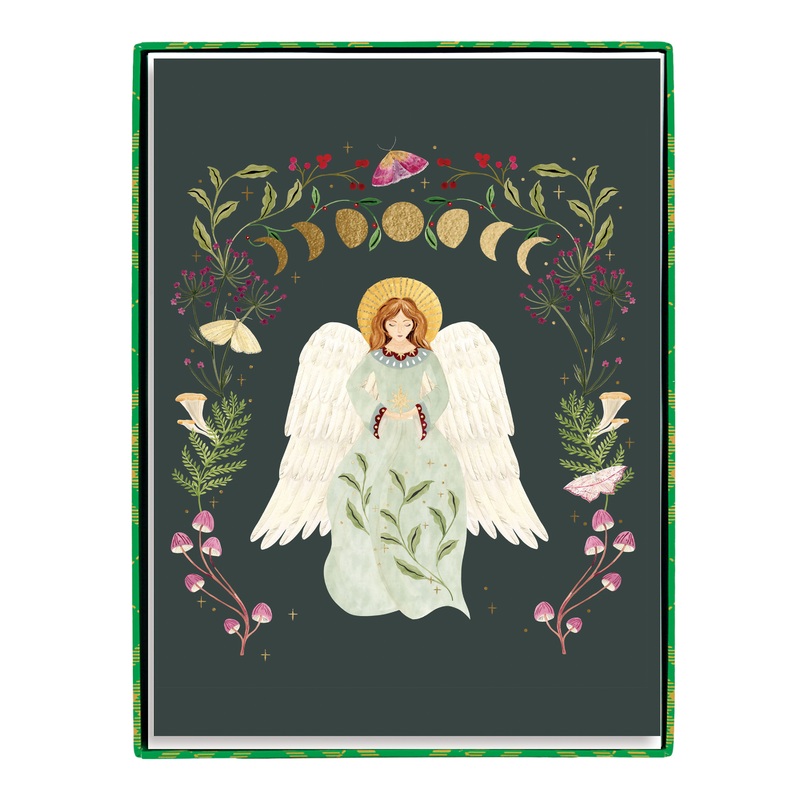 Send a greeting of celestial wonder this holiday season with this set of boxed cards featuring a warm message inside. Gold foil moon phases, woodland mushrooms and colorful moths and berries surround an angelic figure on a forest-green background. They are