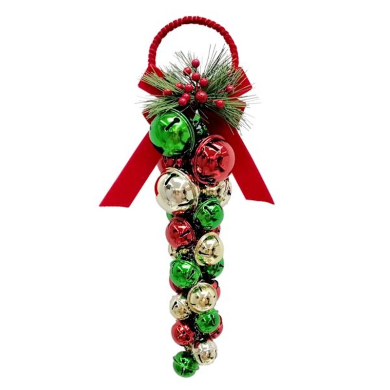 Enjoy all the traditions of Christmas with pops of and bold patterns make it oh-so-merry, with a touch of black and white graphics with items from our Classic Christmas Collection. Bring a classic jingle to your home with this metal bell door hanger in red, green and gold. Layered bells, faux greenery and a bold bow deliver a bright chime every time the door moves. At 15in. long, it hangs easily from a doorknob or wall hook to dress up your entryway, hallway, or mantel. A cheerful alternative to a wreath, this Christmas door hanger keeps the season joyful from the first hello.