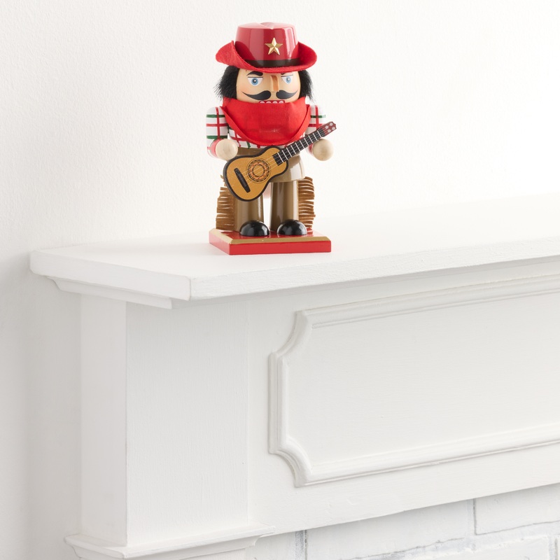 Home for the holidays meets home on the range in our wooden cowboy nutcracker, charming from the top of his 10-gallon hat to the tips of his fringed chaps. With a plaid shirt, red bandana, and handy guitar, he delivers a classic look and winning western st