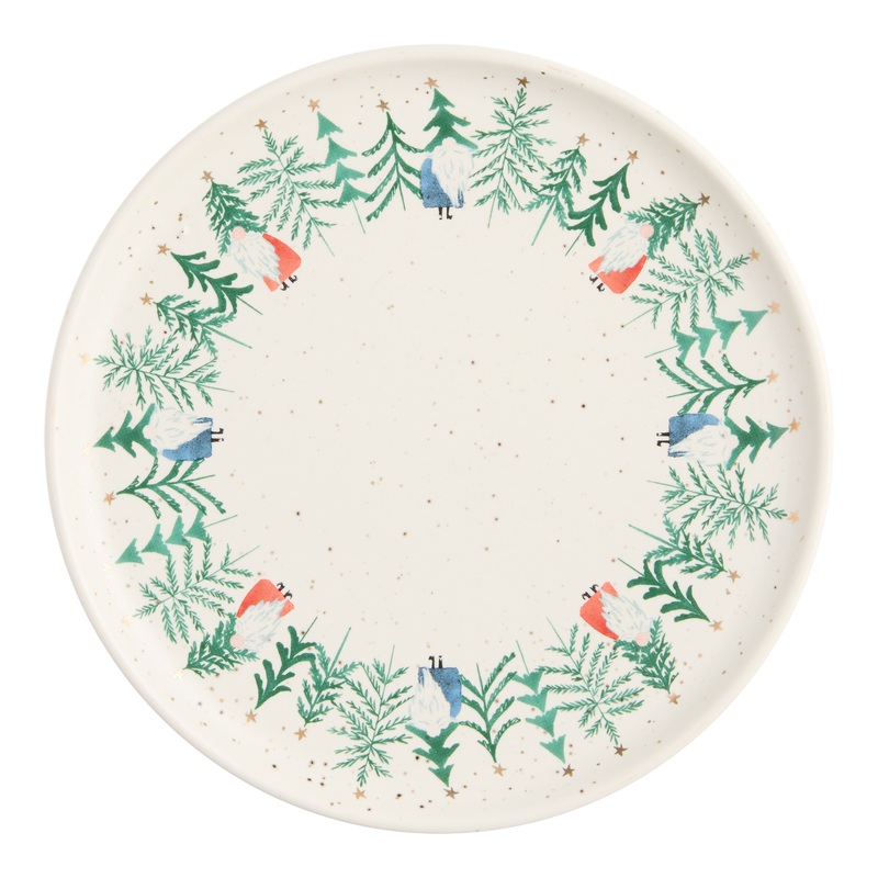 Our exclusive, whimsical gnome artwork is printed with a matte effect on this sweet holiday salad and dessert plate. Festive and fanciful dinnerware for the yuletide season, these bearded forest gnomes sport Christmas tree hats with gold-star toppers. Made of stoneware with a speckled cream ground, our small plate sets a modern-meets-rustic table that’s also perfect for setting out cookies for Santa.