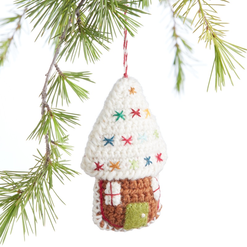 Home sweet home is sweet indeed in this crocheted Christmas ornament, a miniature gingerbread house fashioned from wooly yarn. Featuring a tiny green door, an oversized white roof sprinkled with multicolor stars and loads of lovely stitching, it's a perfec