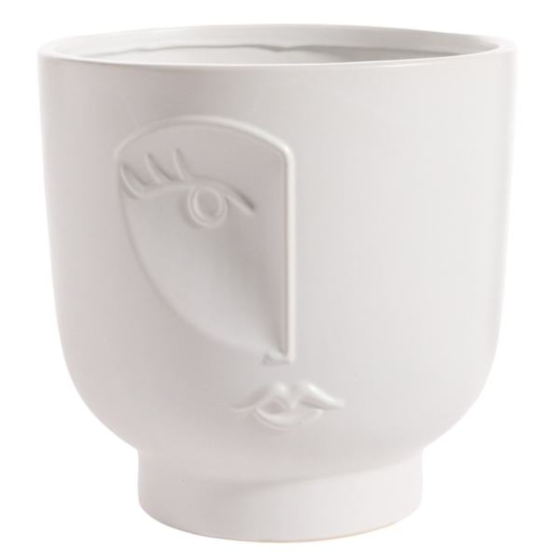 Brighten up your space, one playful planter at a time.This modern-style planter brings a fun, modern touch to your space with its Crosby St. decor theme. The white finish creates a sleek home for your vibrant plants. Its minimalist design ensures it complements a wide range of interior styles, making it a versatile addition to any room.Made from ceramic, this planter is designed for both functionality and style, fitting in perfectly whether placed in your cozy living room or on a lively balcony. Its artistic face adds personality to your plant display, creating a welcoming atmosphere. Ideal for ferns, succulents, or any of your favorite plants, it’s ready to refresh your space with ease.Part of the Crosby St. collection.Modern style with a playful twist.Eye-catching face design adds character.Perfect for a cozy living room or a lively balcony.Made from ceramic.Dimensions8.8″ L x8.8″ W x9.0″ H Weight5.5 lbs.ColorwhiteMaterialCeramicDepartmentPatioLocationOutdoor DcorUPC197154358825Location ID42-TG02B