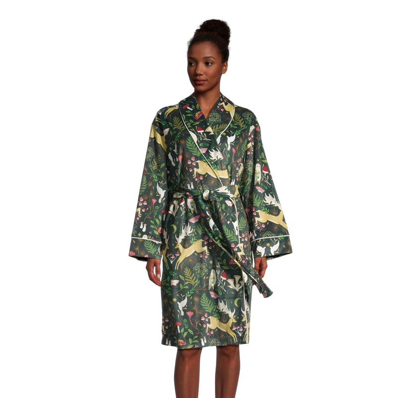 This charming bathrobe showcases our exclusive folkloric-forest artwork in a rich palette of green, red and white. Detailed with owls, tiny mushrooms, winter foliage and more, this incredibly soft, lightweight-fleece sleepwear is a whimsical addition to an