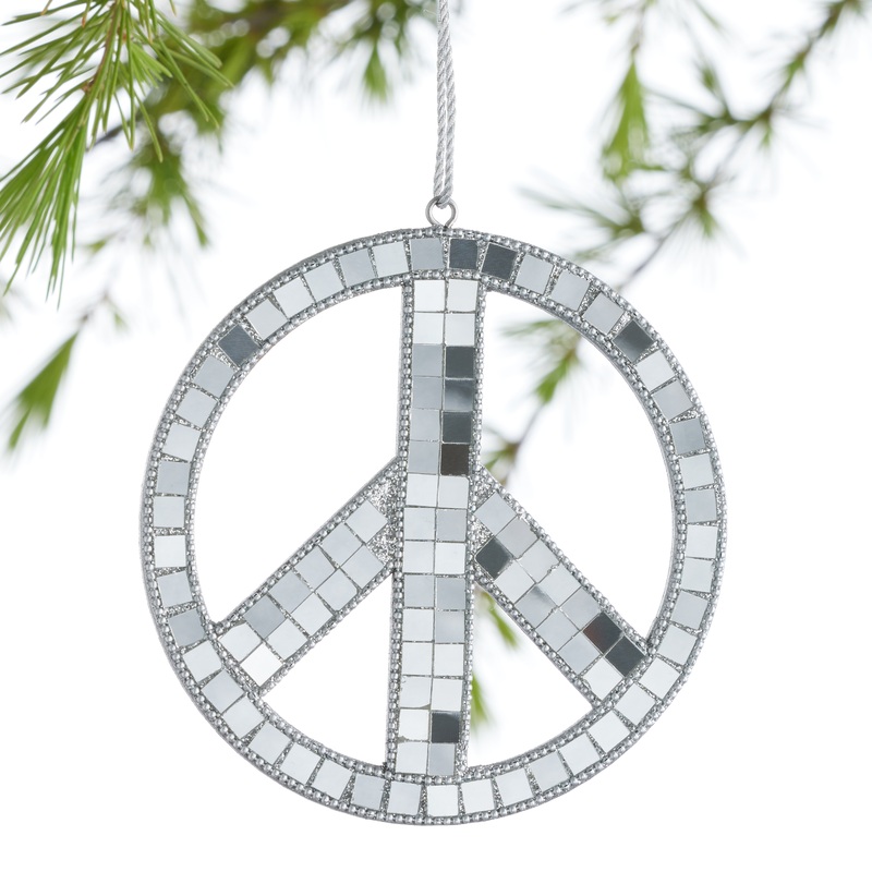 Let there be peace on earth and party-ready style on your tree this Christmas with our disco ball-inspired peace sign ornament. Covered in dozens of tiny mirrors and heavily glittered to catch the light, this silver decoration dazzles through the holiday season and beyond.