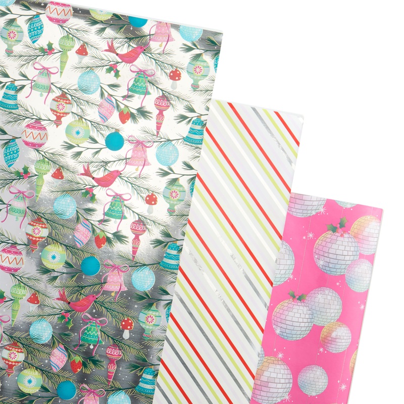 Add a sparkling touch to your holiday gifts with this 3-pack of wrapping paper rolls. Featuring dazzling disco balls on bold pink, classic candy cane stripes and vintage-inspired ornaments, this set offers a chic mix of designs that bring both retro flair