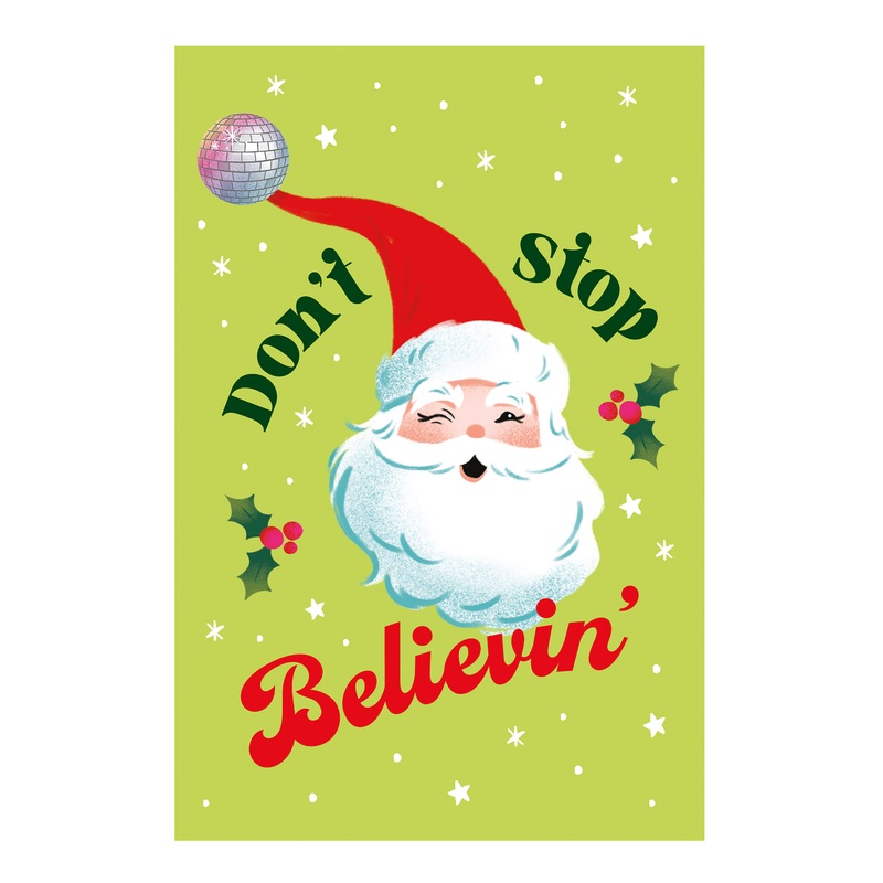 Send a little Christmas feeling this holiday season with this set of boxed cards that features a winking Santa and the words "Don't Stop Believin'." Santa's red hat has a glittery disco ball at the tip and there's a warm message inside the card. It's a jol