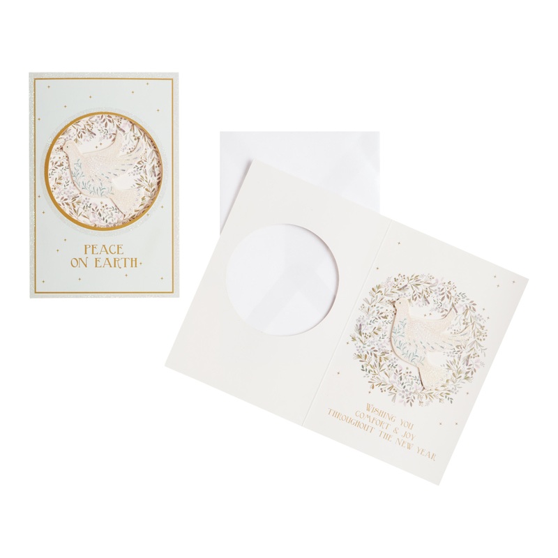 Spread holiday cheer with our exclusive set of boxed cards. With a warm message inside, each card features a die-cut window that reveals a 3D dove and glitter accents. In a box made of recycled materials, this set includes 15 iridescent envelopes that give
