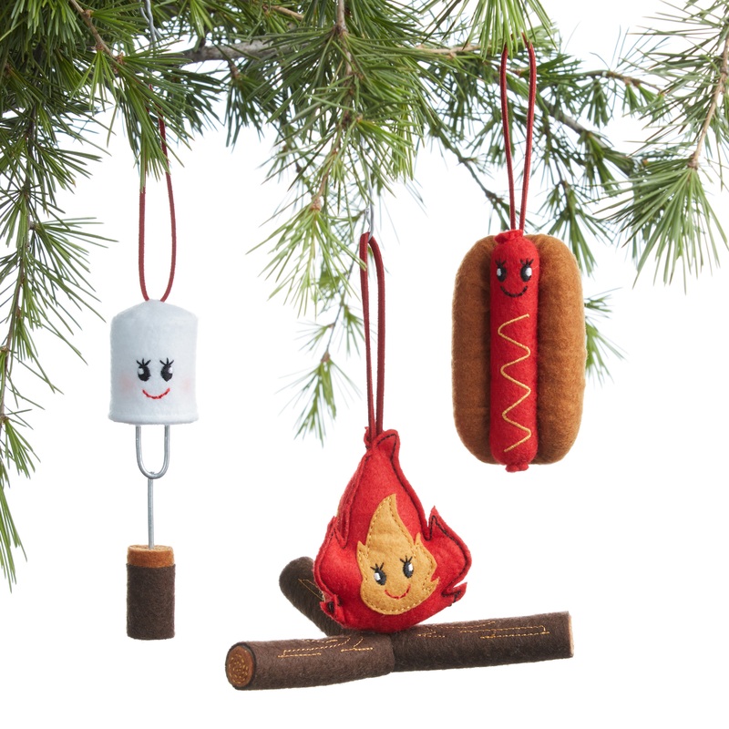 When the weather outside is frightful this holiday, cozy up with our delightful campfire-themed Christmas ornaments. Crafted of soft felt, accented with stitched details and beaming with warm smiles, the set includes a roaring fire along with a hot dog and skewered marshmallow for roasting.