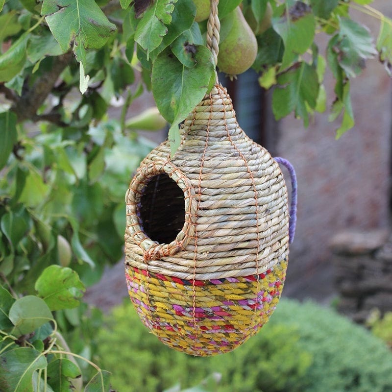 | Handmade to the highest quality finish using natural sea grass and recycled saris. Every nester is unique in colour and pattern. The Shesali is the medium sized Oval model. Oval in shape it offers a medium sized cavity perfect for species of small garden bird who roost alone or in a pair. Nester has a sturdy inner frame for support. Attached metal hooks at the rear and a long loop at the top ensure you can fasten the nester securely. The nester has a small round entrance reinforced with steel. Position the bird nester in a sheltered space to keep out harsh weather. Preferably face the bird nester between North and South-East. By purchasing our World Fair Trade Organisation product youll be supporting many women and their families from rural communities in desperate poverty in Southern Bangladesh.Size: 21 x 11.5 x 13cm |