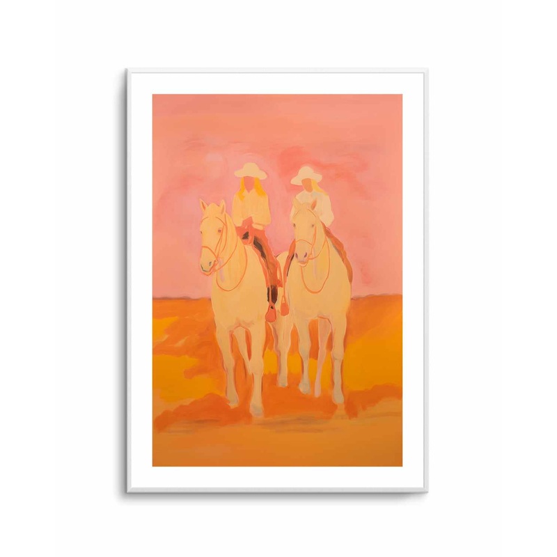 Two Girls Riding a Horse and Wearing a Cowboy Hat with an Orange and Dark Pink Background Illustration ArtAll art is printed right here in Australia with the highest-quality materials and professional printers. You can trust our craftsmanship and attention