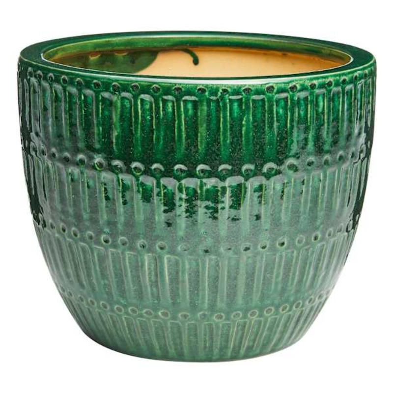 Explore what’s right around the corner. Choose your own adventure every day. Savor it all and say yes to what comes next. Found & Fable is a collection only found at At Home. Highlight your green thumb and showcase your annuals and perennials at your front door or lend a pop of festive foliage to the deck with our 11in. Indoor Green Glazed Ceramic Nico Pot. More than just a spot to display your gardening skills, this wonderful flared embossed channel and dot ceramic planter offers a convenient display with its fun rounded shape. Designed to live indoors or in a covered outdoor space, it’s ready and waiting to make your plants pop.Dimensions11.4″ L x11.4″ W x8.7″ H Weight9.9 lbs.ColorgreenMaterialCeramicDepartmentPatioLocationOutdoor DcorUPC197154135211Location ID42-GL02C
