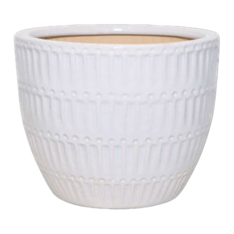 Explore what’s right around the corner. Choose your own adventure every day. Savor it all and say yes to what comes next. Found & Fable is a collection only found at At Home. Highlight your green thumb and showcase your annuals and perennials at your front door or lend a pop of festive foliage to the deck with our 11in. Indoor White Glazed Ceramic Nico Pot. More than just a spot to display your gardening skills, this wonderful flared embossed channel and dot ceramic planter offers a convenient display with its fun rounded shape. Designed to live indoors or in a covered outdoor space, it’s ready and waiting to make your plants pop.Dimensions11.4″ L x11.4″ W x8.7″ H Weight9.9 lbs.ColorwhiteMaterialCeramicDepartmentPatioLocationOutdoor DcorUPC197154135181Location ID42-GL02B