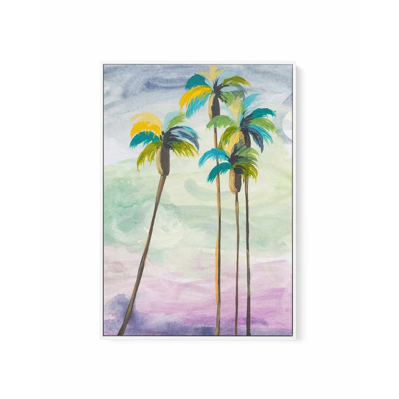 Transform your home's decor with Four Palms II by Jan Weiss, a stunning framed canvas art print featuring an abstract landscape artwork of vibrant palm trees in yellows, pinks and turquoise tones. Perfect for enhancing your living room, bedroom, dining roo