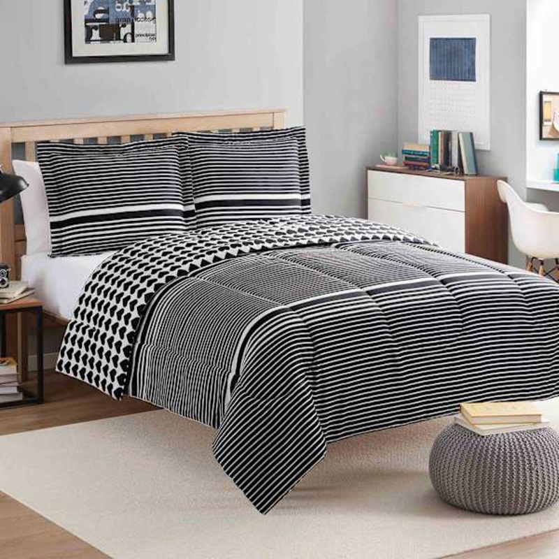 Glambition 3-Piece Black & White Heart Striped Print Essential Comforter Set, Full/Queen