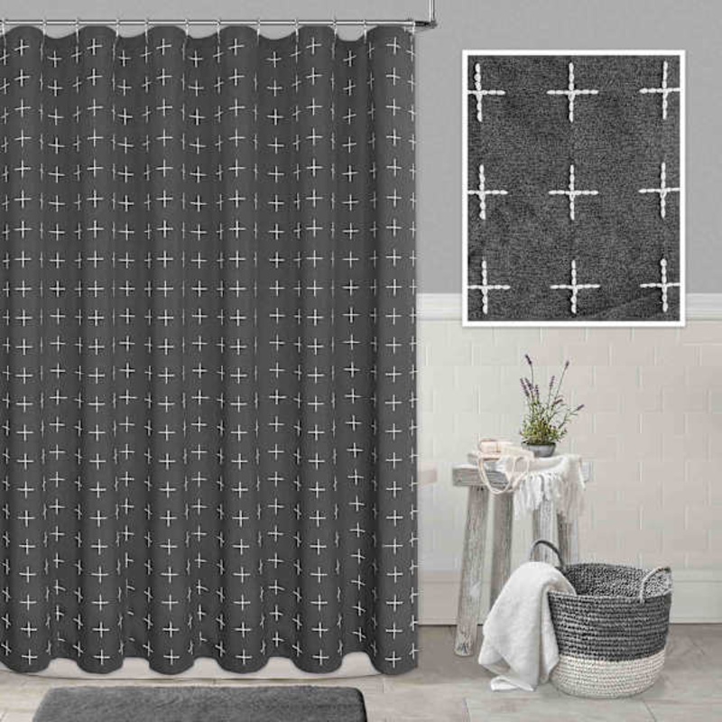 Modern farmhouse meets At Home prices in Honeybloom, our exclusive new brand that celebrates life lived together. This 72in. grey crossover embroidered shower curtain has universal appeal. The fabric is washable for easy care. It keeps your bathroom bright