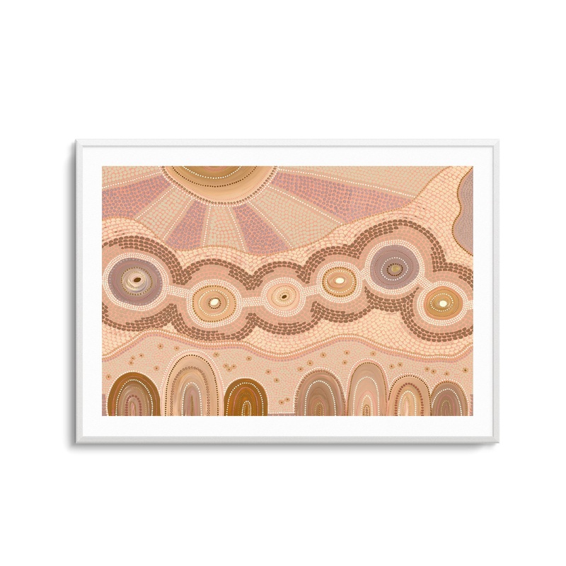 Soft neutral earthy tones feature in this Aboriginal abstract artwork by artist Domica Hill.With intricate dot work showcasing circles and sun rays in this art piece with Indigenous Australian stories. A painting reproduction, 'Growing Connections' is perf