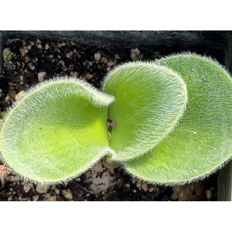 Lovely Amaryllid from South Africa’s Drakensberg Mountains, this form given to us by California plantswoman Myrtle Wolf, each bulb sitting above ground with thickened, opposite leaves covered with a most endearing fur. The plants quickly offset, the larger bulbs producing white flowers consisting mostly of stamens, looking well.like floss or a shaving brush. Bright light for best look and regular summer water. Has actually been garden hardy for us in USDA zone 8 in perfect drainage in protected spots but we recommend small containers anywhere temperatures drop to 20F, bottom of USDA zone 9.