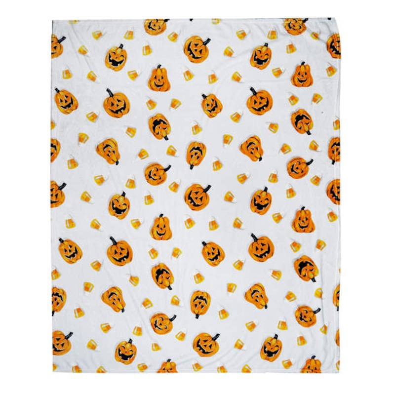 Craft a happy haunt with jolly jack-o-lanterns and friendly ghosts in elevated materials with items from our Happy Haunting Collection. Go all out Halloween and cozy up this haunting season with our Jack-O’-Lantern Plush Throw Blanket. Featuring a wonderful micro-plush polyester fabric, this seasonal white, orange and black throw will keep you warm and toasty. Measuring 50x60in., this luxurious soft plush throw is large enough to curl up in and year ’round in classic Halloween style.
