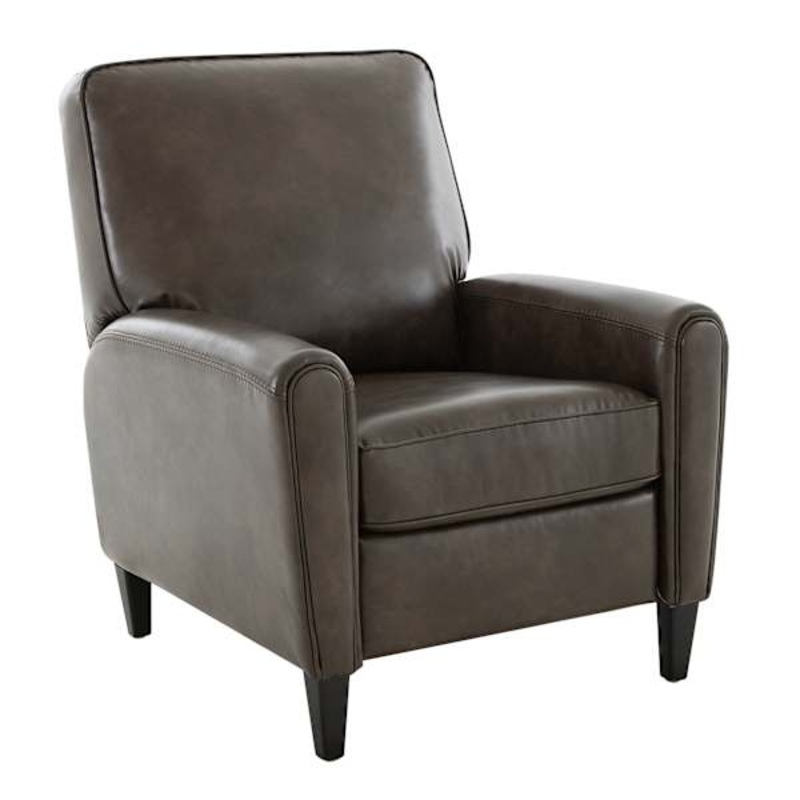Modern farmhouse meets At Home prices in Honeybloom, our exclusive brand that celebrates life lived together. Created exclusively for someone that embodies transitional decor, our dark brown Honeybloom Harrison Recliner introduces a simple comfort to your living room or office aesthetic. This wonderful recliner chair is upholstered in a dark brown faux leather that provides exceptional durability, beauty and comfort. This chair features a high back design that extends down and around into the curved padded arms. Its modern silhouette and brown finish wooden feet works with nearly any interior design.Dimensions31.5″ L x41.8″ W x40.5″ H Weight97.0 lbs.ColorbrownMaterialFaux LeatherDepartmentFurnitureUPC197154409091Location ID40-39A