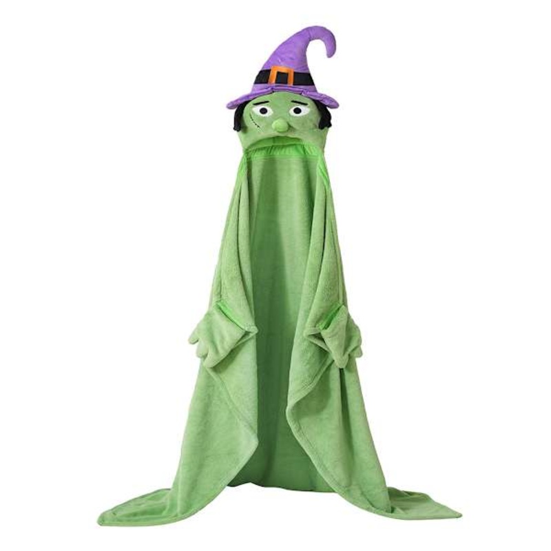 Go all out Halloween and cozy up this haunting season with our Hooded Halloween Witch Throw Blanket. Featuring a wonderful polyester micro-plush fabric, this seasonal green, black, and purple hooded witch with purple hat throw will keep you warm and toasty. Measuring 50x60in., this luxurious soft plush throw is large enough to curl up in and year ’round in classic Halloween style.