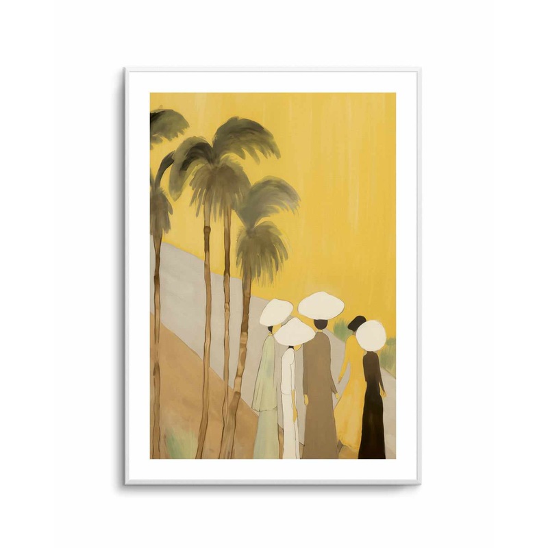 People Wearing a Rice Hat while Looking at the Mountain View with Palm Trees on the Side on a Light Orange and Beige Background Illustration ArtAll art is printed right here in Australia with the highest-quality materials and professional printers. You can