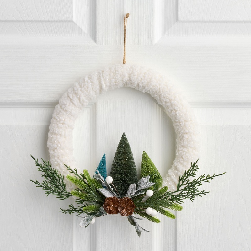 A beautiful sight indeed, our winter wonderland-inspired wreath brings uncommonly cozy style to the holiday season. This 11-inch hanging decor is wrapped in fluffy ivory sherpa fabric and accented with a trio of cool-toned bottlebrush trees, real pinecones