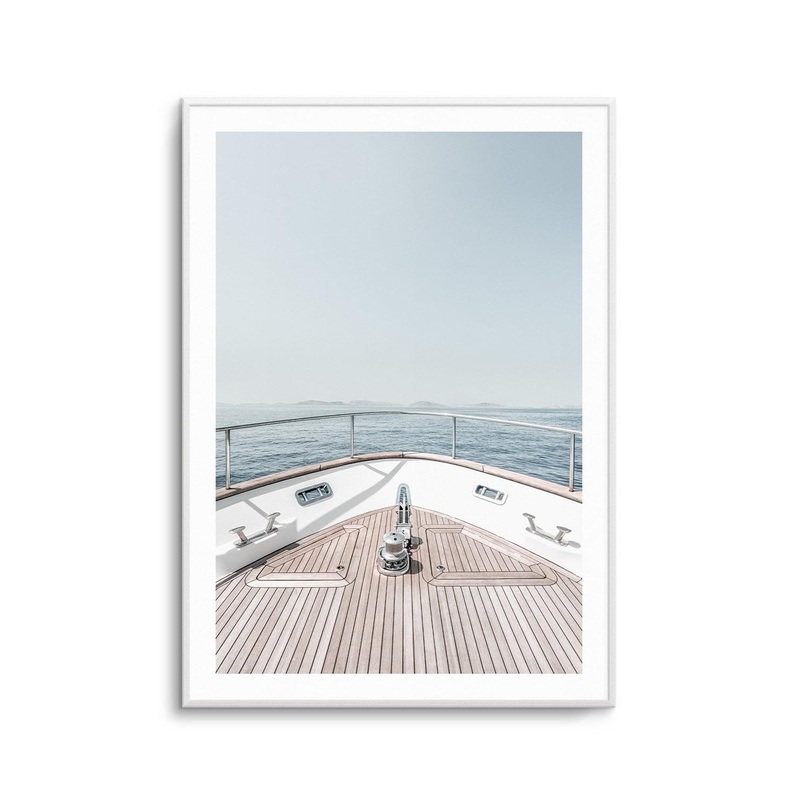 This chic coastal art print featuring a boat at the end of a dock with calmingblues andwhites, is perfect for any home or office. A calming seaside photographic art print, is a must for any modern Hamptons style coastal home.