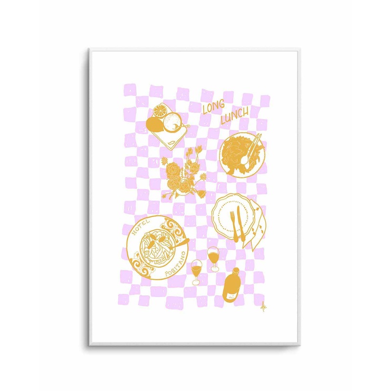 Minimalist Gold Ceramic Plates with Pasta and Salad On CheckeredPurple Pattern Table Cloth Illustration ArtAll art is printed right here in Australia with the highest-quality materials and professional printers. You can trust our craftsmanship and attentio