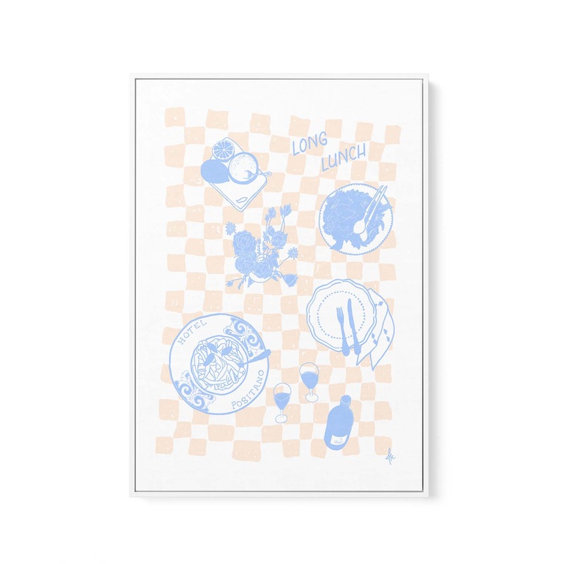 Long Lunch Soft Blue Pink by Anne Korako | Framed Canvas Art Print