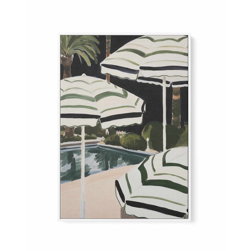 Outdoor Pool and Parasol with Trees on the Side on a White and Green Patterned Background Illustration ArtAll canvas art prints are printed with the highest-quality materials and professional printers. You can trust our craftsmanship and attention to detai