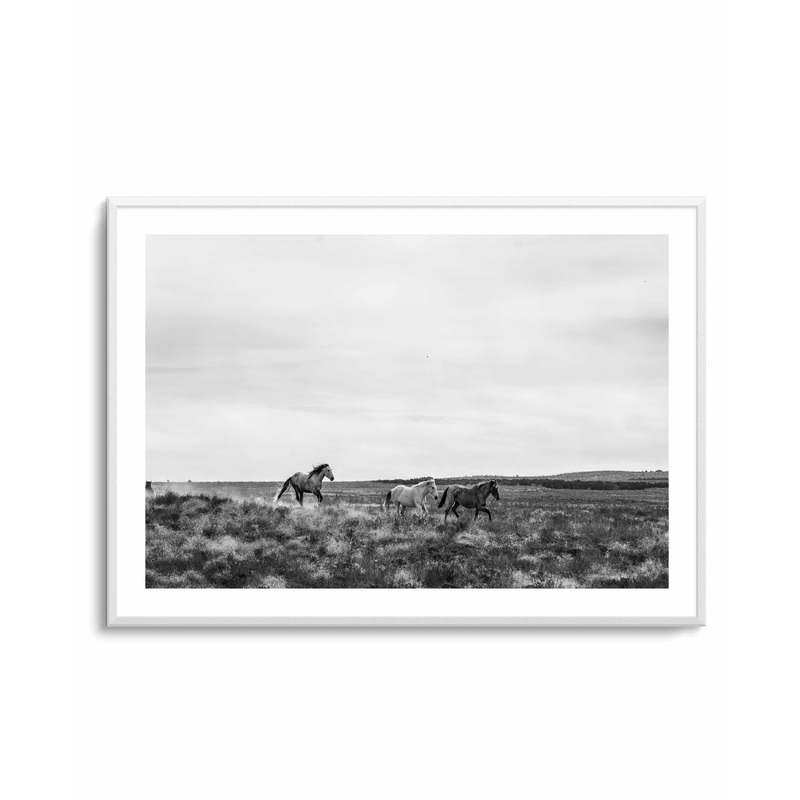 Three horses running on grassy land on a Black & White Background Illustration ArtAll art is printed right here in Australia with the highest-quality materials and professional printers. You can trust our craftsmanship and attention to detail when it comes
