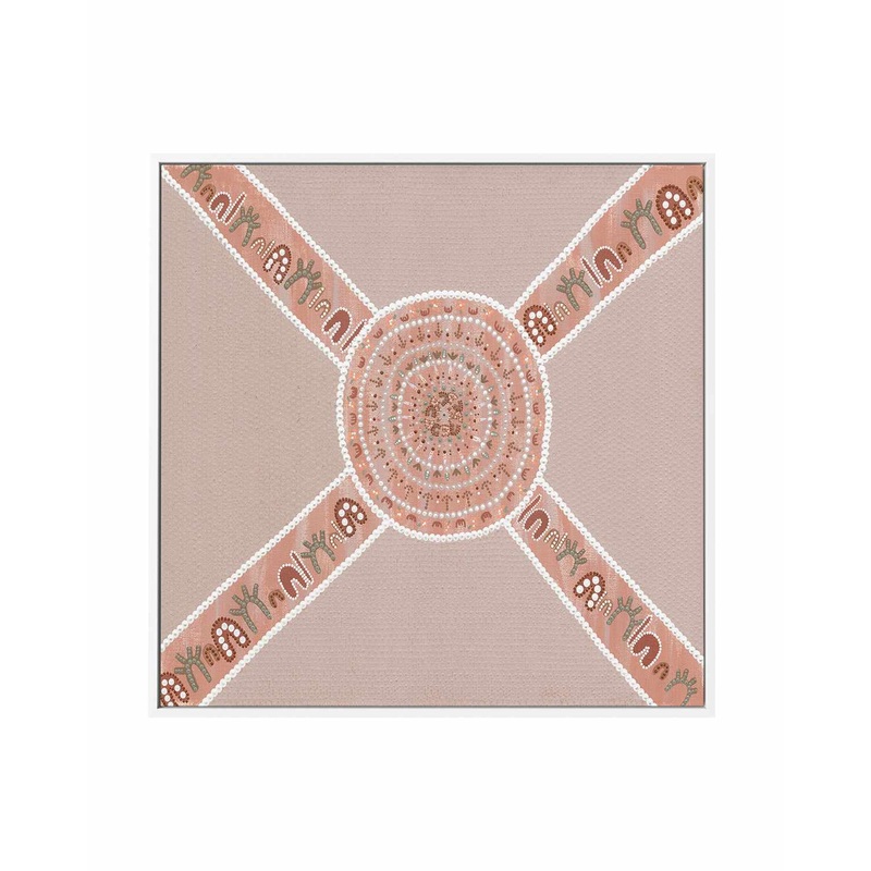 Welcome to the enchanting world of ‘Meeting Place’ by Karissa Undy. This beautiful dot painting reproduction canvas print enhances any room and captivates the eye with its muted purples, earthy browns, and hints of sage green. The deep richness of colour adds an elegant touch to your home dcor while incorporating elements of aboriginal art inspired by indigenous dreamtime. Talented Aboriginal artist, Karissa Undy has created a sophisticated and inviting design that begs for closer inspection.