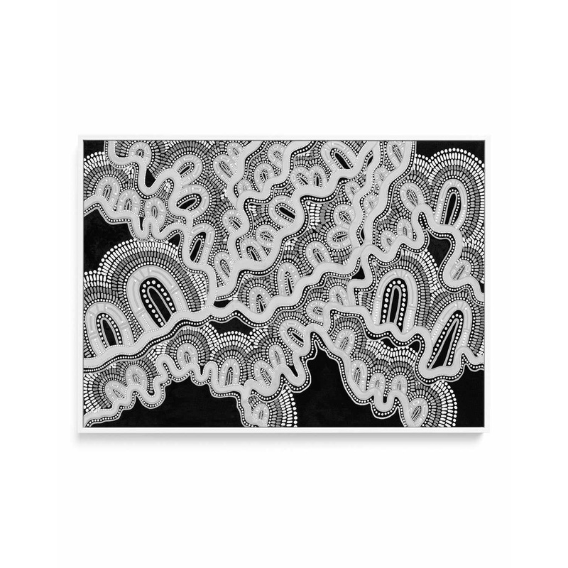 This beautiful Aboriginal canvas dot art print was created in stunning black & whiteand is an eye-catching piece which is sure to make an impact on anyone who sees it. If you are looking for breathtaking Aboriginal art prints & Aboriginal dot art prints, look no further than !