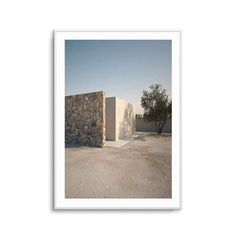 'Muro' by Guachinarte is the perfect wall art print for anyone looking to add a unique architectural touch to their home. With its subtle tones, pale blue sky, stone wall, gravel pathway and a tree, this modern architectural3D rendered artcaptures all of t