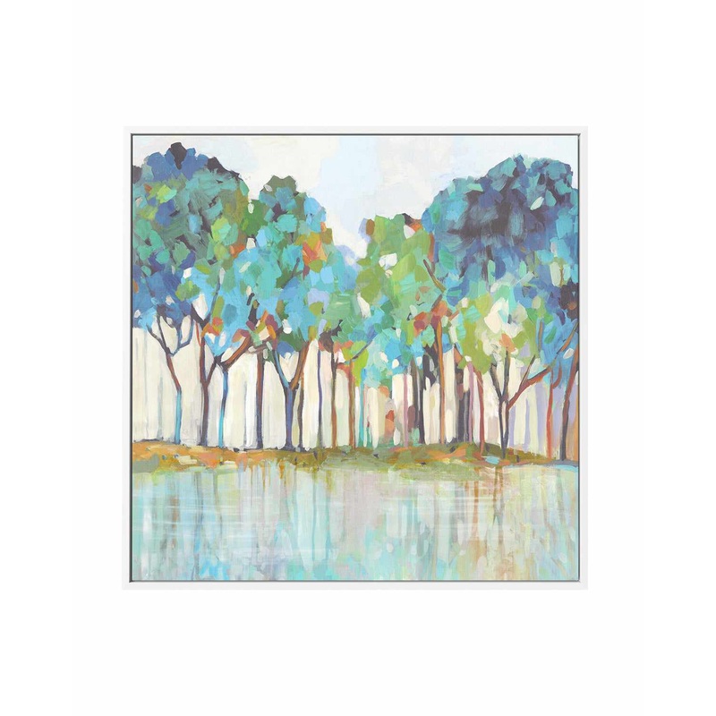 Add some modern decor into your living space with 'On That Side of Dream', a stunning painting reproduction framed canvas print featuring a modern landscape painting reproduction of trees in a forest with tones of blues, green and beige. Perfect for any li
