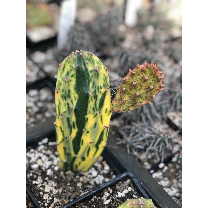 A most attractive variegated prickly pear with but few spines and striking green, cream, and yellow stripes on each pad. The plant often tinted orange in sun or with winter frost. To about 3 x 3 feet in as many years. The mexican origin dictates hardiness only to the bottom of zone 9, possibly 8 if super duper dry. Excellent container plant and not particularly water sensitive.