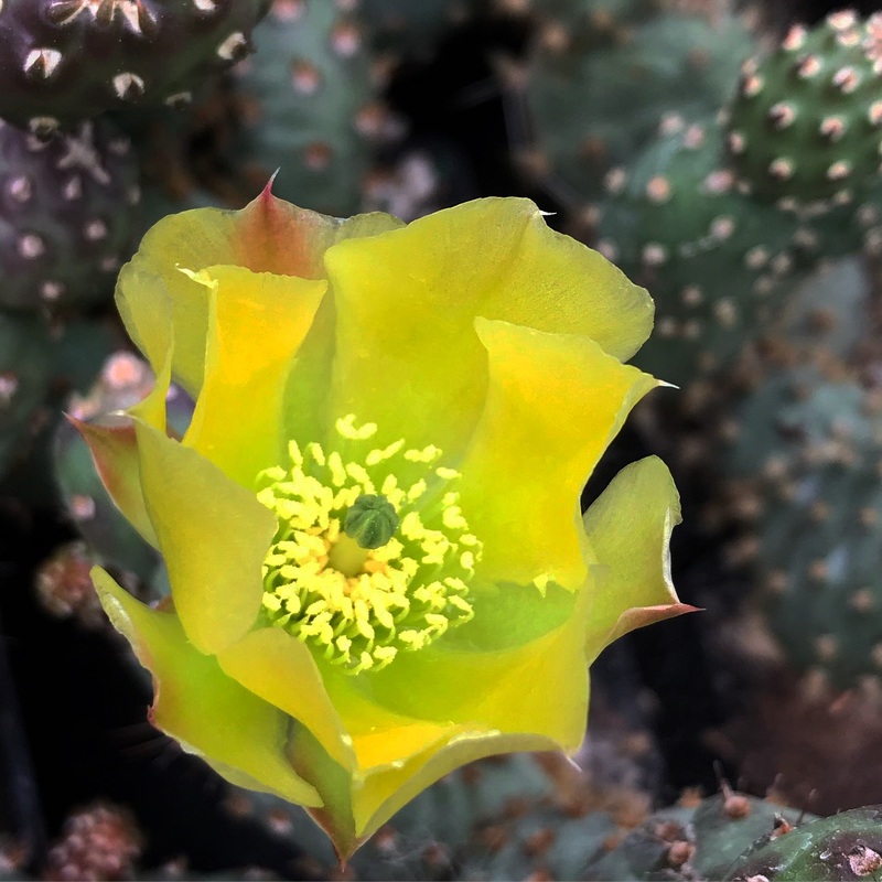 This variety of the fragile prickly pear from the western Colorado plateau tends to be almost entirely nekkid, not even having the tiny glochids we've come to enjoy. A favorite of rock and trough gardeners, these have round pads, to under 2", that clump to