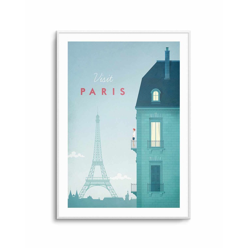 Enhance your home's decor with 'Paris' by Henry Rivers a wall art print featuring an illustration of a Parisian woman on a balcony wearing a red beret with the Eiffel tower in the background. Perfect for enhancing your living room, bedroom, dining room, of