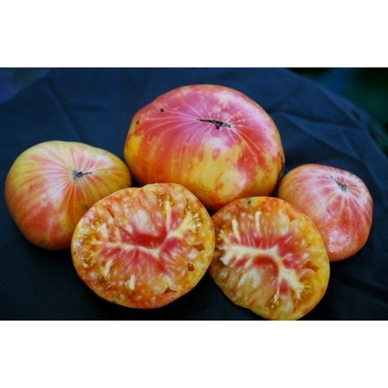 " Large beefsteak style tomato sometimes weighing up to two pounds. Ripens to a beautiful bright yellow, often with red stripes. This variety has a mild flavour and meaty flesh with relatively few seeds. Plants tend to be high yielding