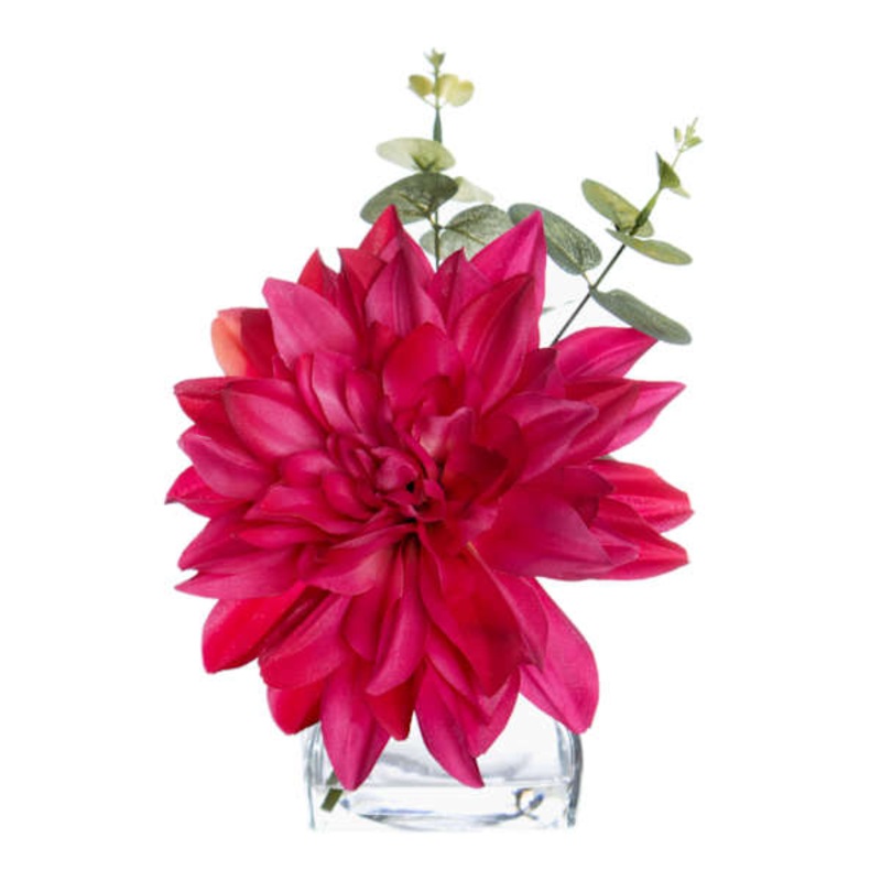Add a pop of floral charm to your space. Brighten up any room with the Pink Dahlia & Eucalyptus in Glass Vase. Crafted with an artistic touch, this display features vibrant pink dahlias that effortlessly mimic the beauty of real flowers. Designed to bring